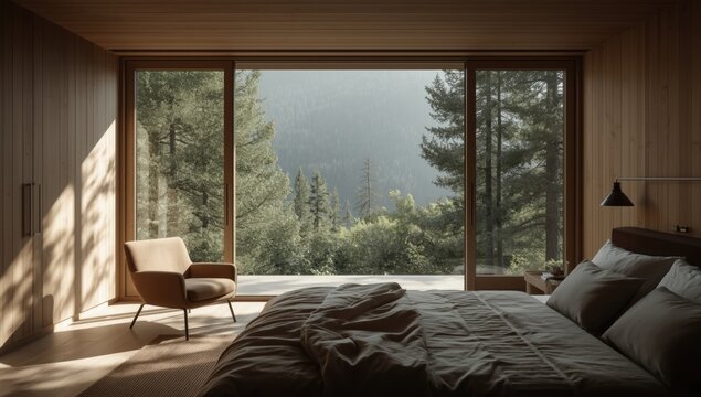 Bedroom featuring large windows providing a serene forest vista, suitable for tranquil design themes
