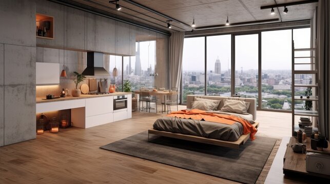 Luxury studio apartment with a free layout in a loft style in dark colors. Stylish modern kitchen with dining area, cozy bedroom area, floor-to-ceiling window with stunning city view. 3D rendering.