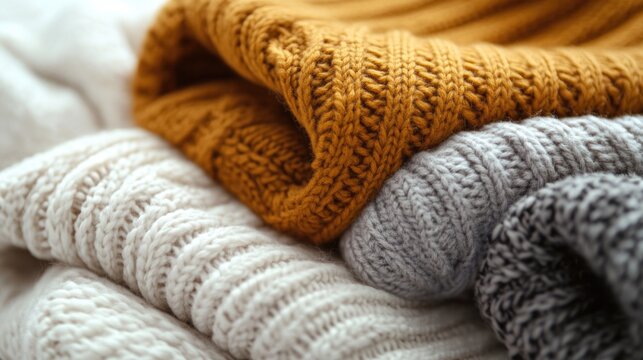 A collection of sweaters stacked on top of each other, a warm and cozy scene