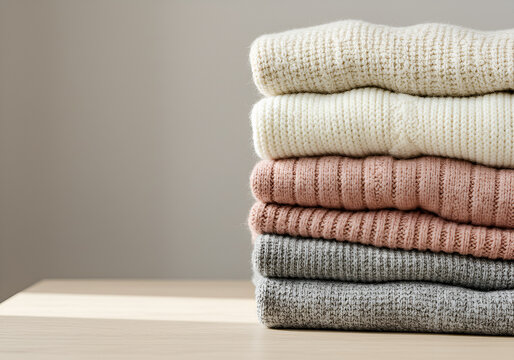 A stack of cozy wool sweaters in fall colors, folded neatly on a wooden...