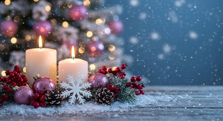 Cozy festive scene with candles, ornaments, and snow, creating a warm and inviting holiday atmosphere in a winter setting.