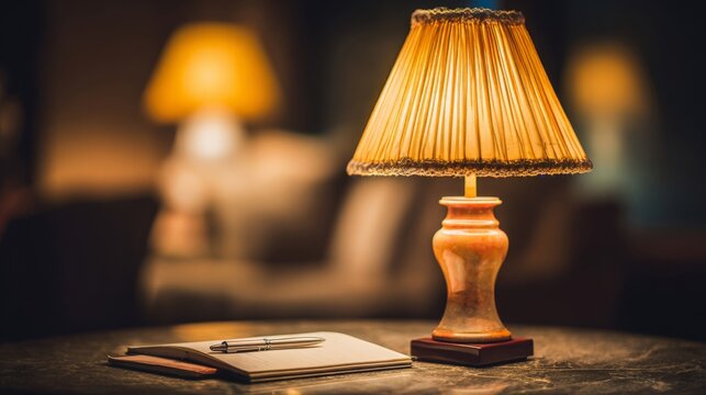 A warm-lit table lamp illuminates a notebook and pen, creating a cozy and inviting workspace ambiance.