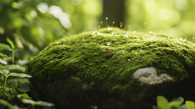 Moss-covered stone in forest, water droplets on moss surface, small insects cra