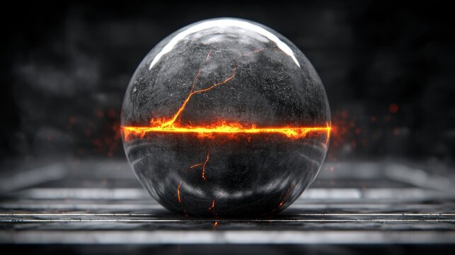 A dark, cracked sphere glows with fiery energy.  Intense light and shadow create a dramatic effect.