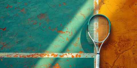 Tennis racket with yellow and orange balls on a cracked teal background. AI generative. .