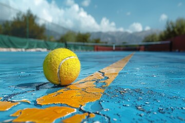 A vibrant tennis ball lies on the cracked blue surface of a tennis court, with an unfocused net in the background