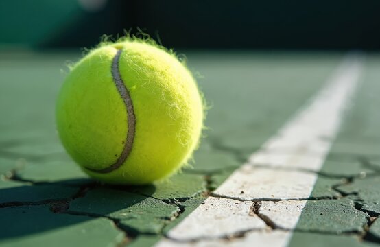 Tennis Ball Resting On the Baseline of a Cracked Court in Sunlight
