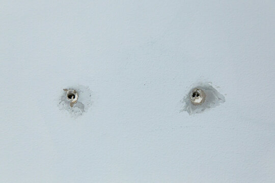 Wall anchors installed in white drywall showing signs of wear, chipped paint and surface cracking from previous fixture removal or installation