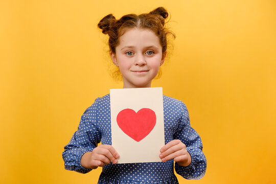 Portrait of pretty positive preteen girl child holding greeting card with heart symbol, happy looking at camera, posing isolated over yellow color background wall in studio. Father's Day concept