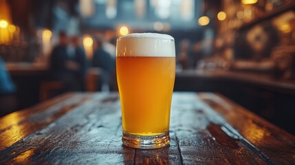 Golden pint of craft beer on rustic table in lively brewpub atmosphere