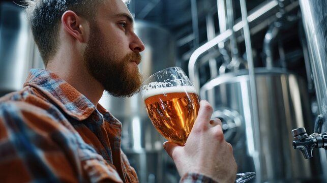 Close up shot of a brewmaster inspecting a sample of craft beer in a brewery with the warm glow of copper kettles in the background emphasizing the art and science behind beer production