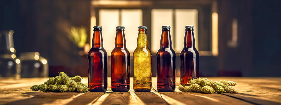 Celebrating Craft: Beer Glasses on Wooden Pub Bar, generative Ai