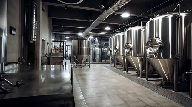 interior of modern craft brewery factory with equipment for beer production. Generative AI illustration