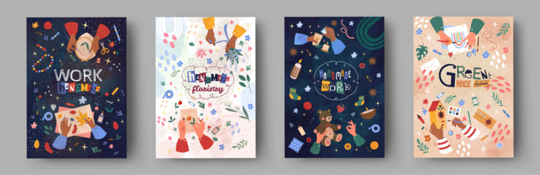 Craft background. Class workshop, Diy posters, handmade toys and candles, creative education, making paper kid, table painting, create herbarium, group knitting, brush. Vector hobby tidy illustration