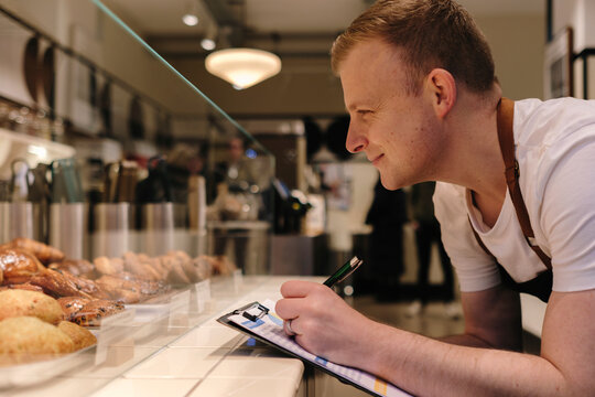 Smiling baker taking inventory on clipboard in bakery