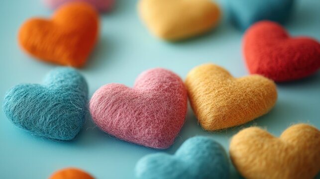 Colorful felt hearts close-up on blue background – ideal for valentine's day craft inspiration