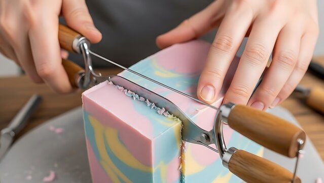 Handmade soap slicing with wire tool, showcasing craft and creative process