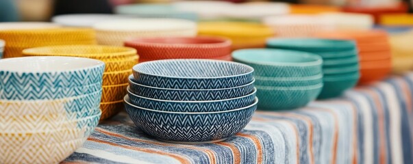 Colorful Pottery Jars at Market; shoppers blurred background; craft sale