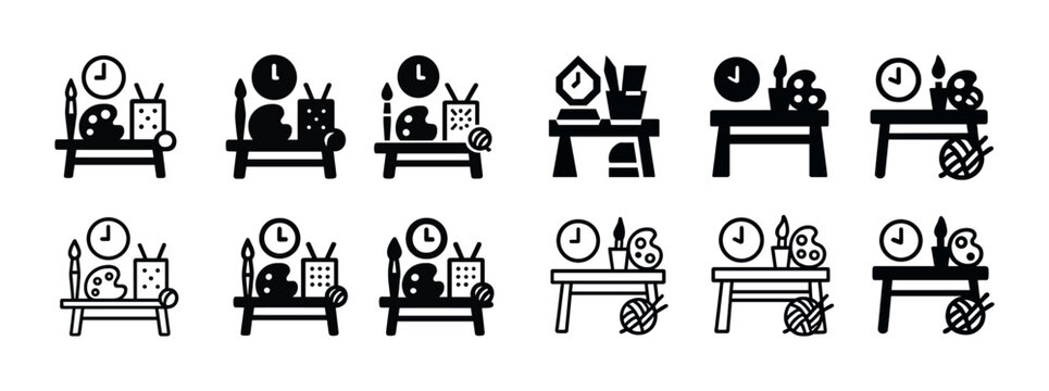 Artistic supplies and time icons in monochrome