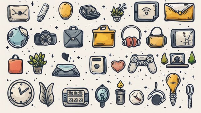 Colorful Art Supplies and Clock on Gray Background for Creative Projects