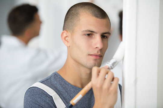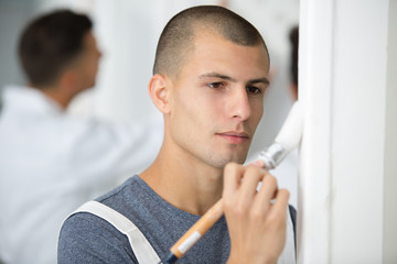 Experienced craftsman teaching young apprentice in a busy lumber workshop