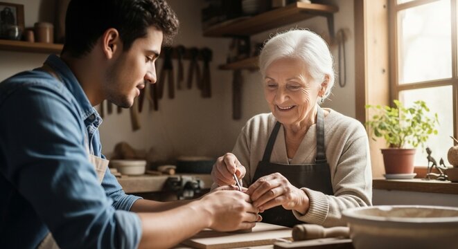 Passing on Tradition: A touching moment between a young man and an elderly woman is seen, engaged in a detailed craft inside a workshop, illuminated by warm light from the window.