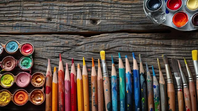 A rustic wooden backdrop holds an array of aged watercolor pots, colored pencils, and paintbrushes, reflecting an artist's tools in vivid detail.