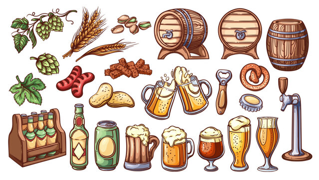 Craft beer brewing icons set featuring equipment and ingredients in flat design