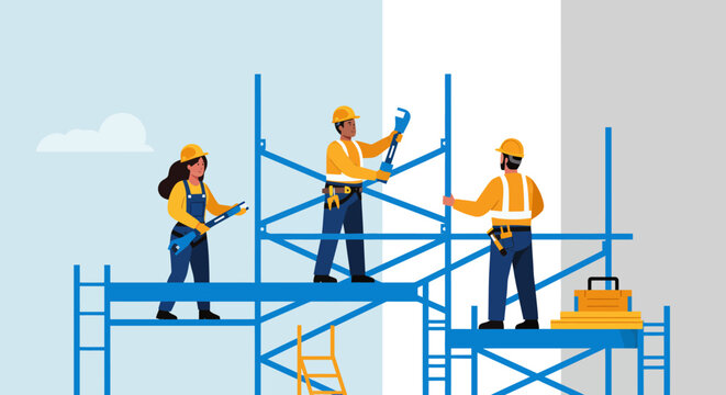 Construction Workers Assembling Scaffolding with Tools and Safety Gear.