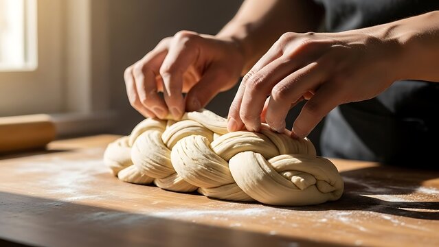 Hands gently crafting a traditional braided challah bread dough skillfully