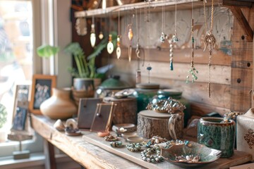 Top view of craftswoman making diy decorations, small business and desktop concept.
