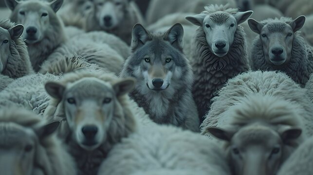 A wolf hiding among a flock of sheep, leading the way or waiting for the right moment to act - Concept of identity and difference, of being unique among others, or metaphor for hidden risk and danger