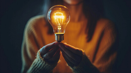 Young entrepreneur showcases innovative business idea with glowing light bulb in a dimly lit environment