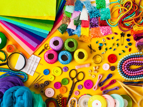 Craft supplies for creative handmade, top view set