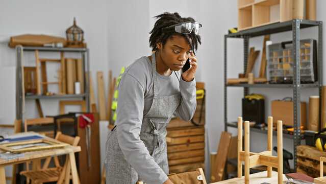 African woman with dreadlocks talking on the phone in a workshop setting indicates a busy woodwork professional indoors.