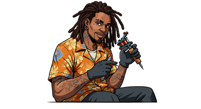 Skilled Tattoo Artist with Dreadlocks Holds Tattoo Machine Ready to Work Isolated on Transparent Background