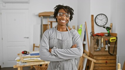 Confident young woman with dreadlocks stands in a carpentry workshop, crossing arms while facing tools and wooden frames