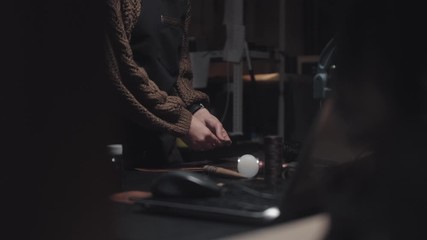 Modern woman has own business, works as a tanner in dark craft workshop, works with tools. Overall plan. Girl with dreadlocks makes the product handmade. Concept craft, manufacturing