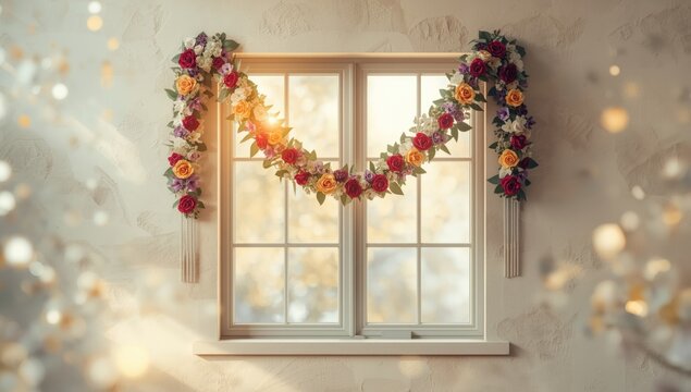 Decorative floral wreath hung above window, showcasing traditional craftsmanship and seasonal floral design