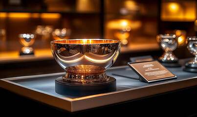 Shiny trophy with geometric design placed on a dark surface, showcasing excellence and achievement at an awards ceremony