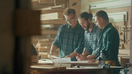 Carpenters Working in a Loft Studio on a New Product Design are Looking at a Blueprint Project and Having a Conversation. Woodworking. Manual Labor. Carpentry, Craftsmanship, and Handwork Concept.