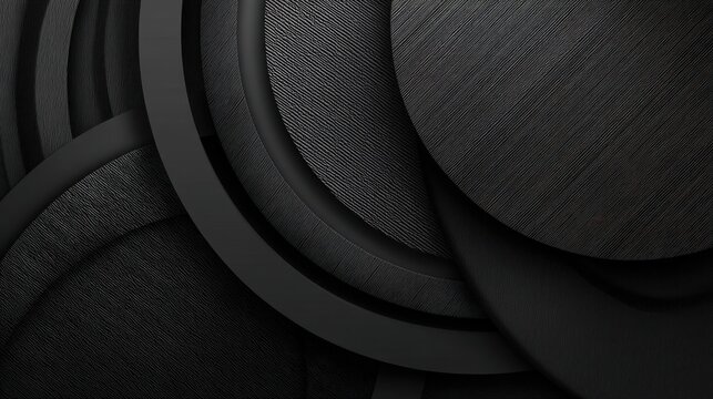 Different shapes of dark materials are stacked together creating layered textures. The arrangement highlights the contrast between the circular forms and the surface details.