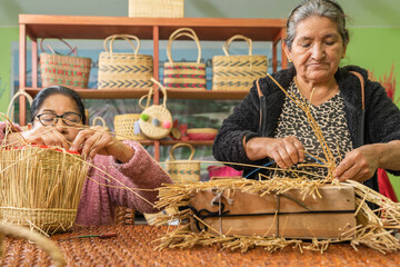 Hispanic craftswomen making straw baskets together