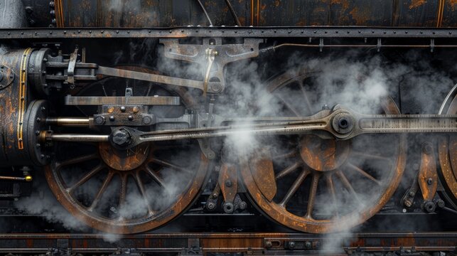 Detailed close-up of old steam train locomotive wheels, showing intricate metalwork, worn textures, and steam rising