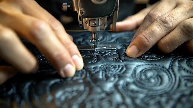 Hands quilting leather on sewing machine