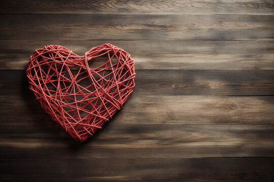 Braided Heart of Red Yarn on a Wooden Background