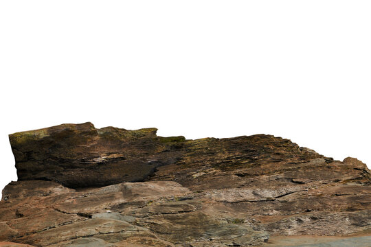 A detailed close-up reveals a rugged, predominantly brown and gray, with subtle hints of green lichen or moss in crevices. The irregular silhouette against a black background emphasizes its uneven