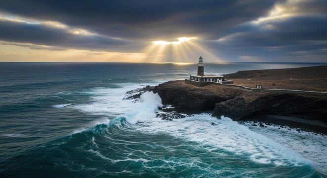 Dramatic seascape with lighthouse.  Powerful waves crash against a rocky shore, with a lighthouse positioned atop a craggy cliff.  Sunbeams pierce a dramatic, stormy sky