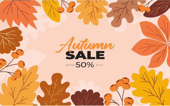 Autumn sale banner with vibrant fall leaves in orange, yellow, and red. Festive design with "Get up to 25%,50%,70% off" text, perfect for seasonal promotions, marketing, and social media campaigns.