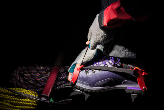 Closeup of Hiking Boots with Mounted Crampons used for Ice Climbing